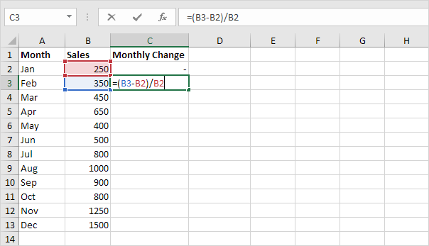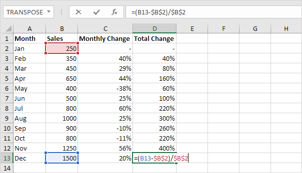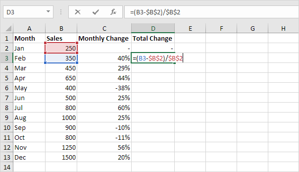 2a. به طور مشابه، ما می توانیم کل تغییر را محاسبه کنیم. این بار مرجع به سلول B2 را اصلاح می کنیم. سلول D3 را انتخاب کنید و فرمول زیر را وارد کنید.
