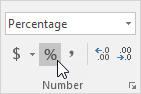 2b. سلول D3 را انتخاب کنید، در زبانه Home، در گروه Number، بر روی فرمت درصد کلیک کنید.